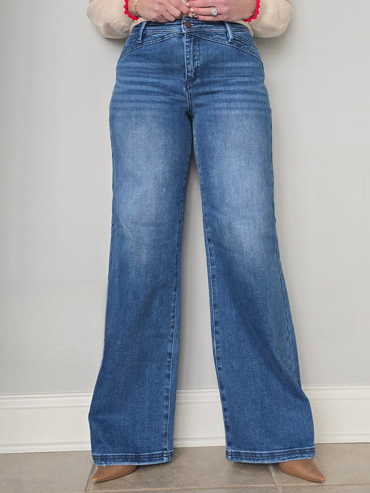 Mid Rise Wide Leg Seam Detail Denim with Front Slit Hem