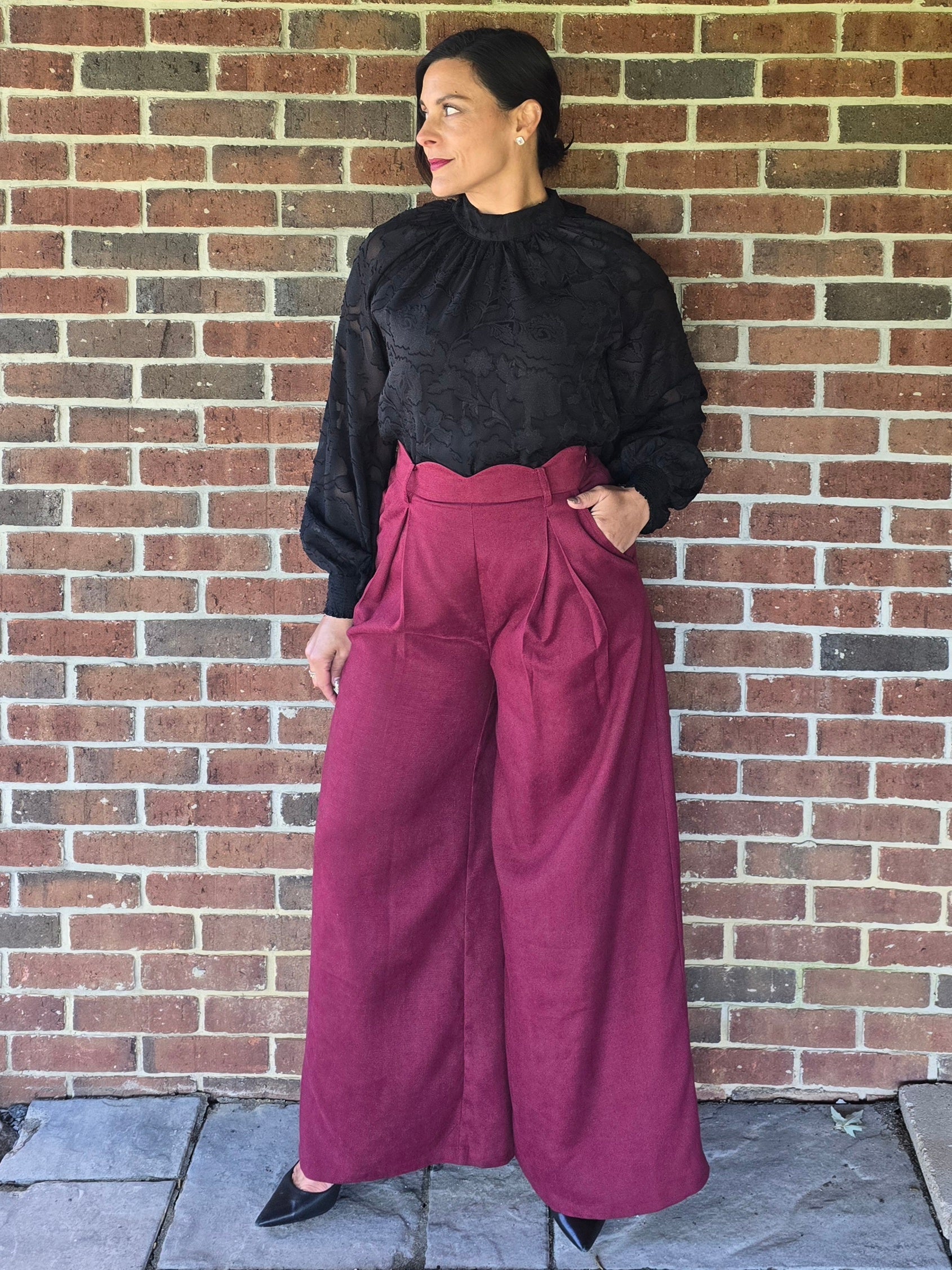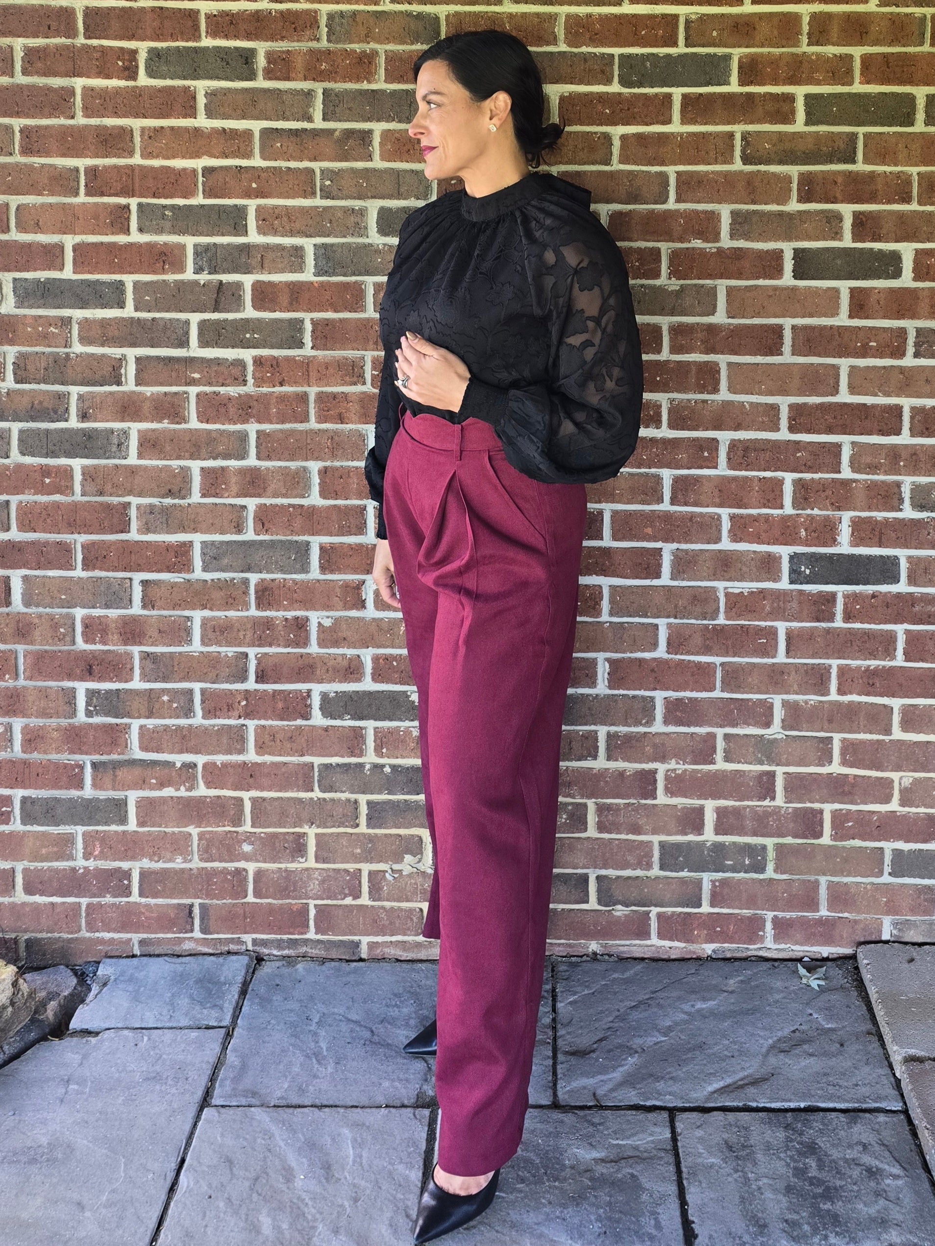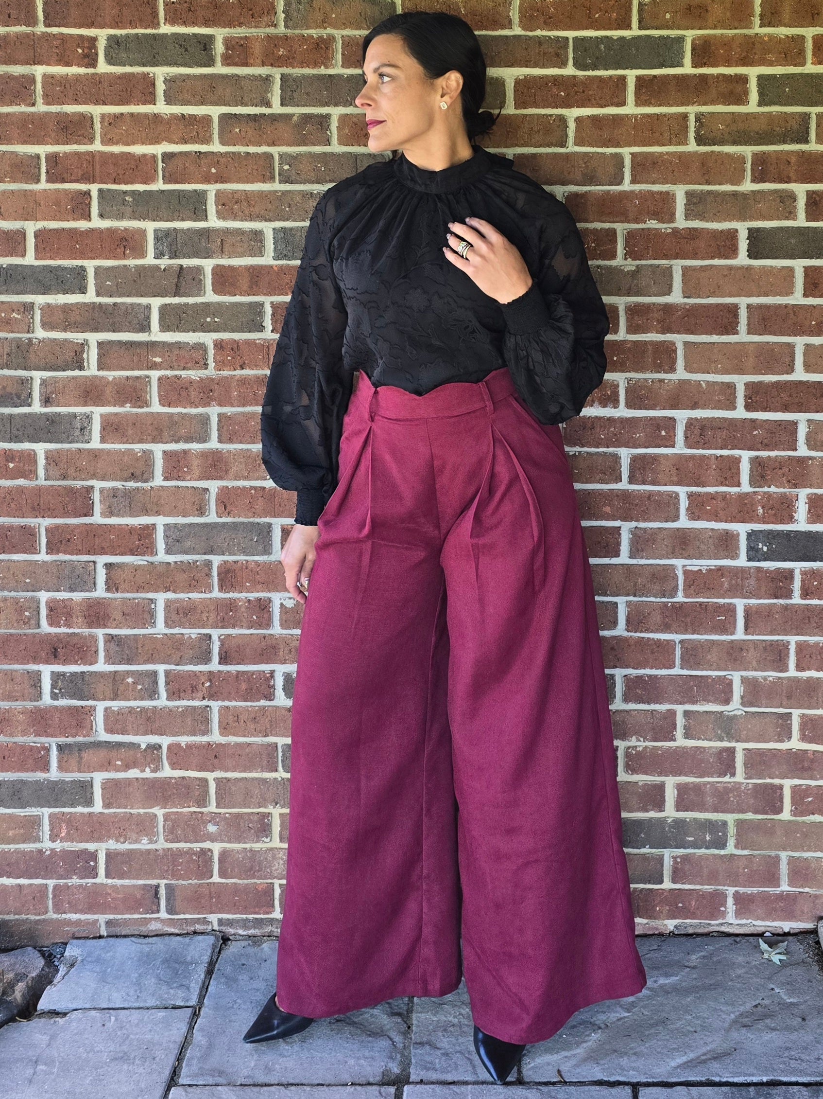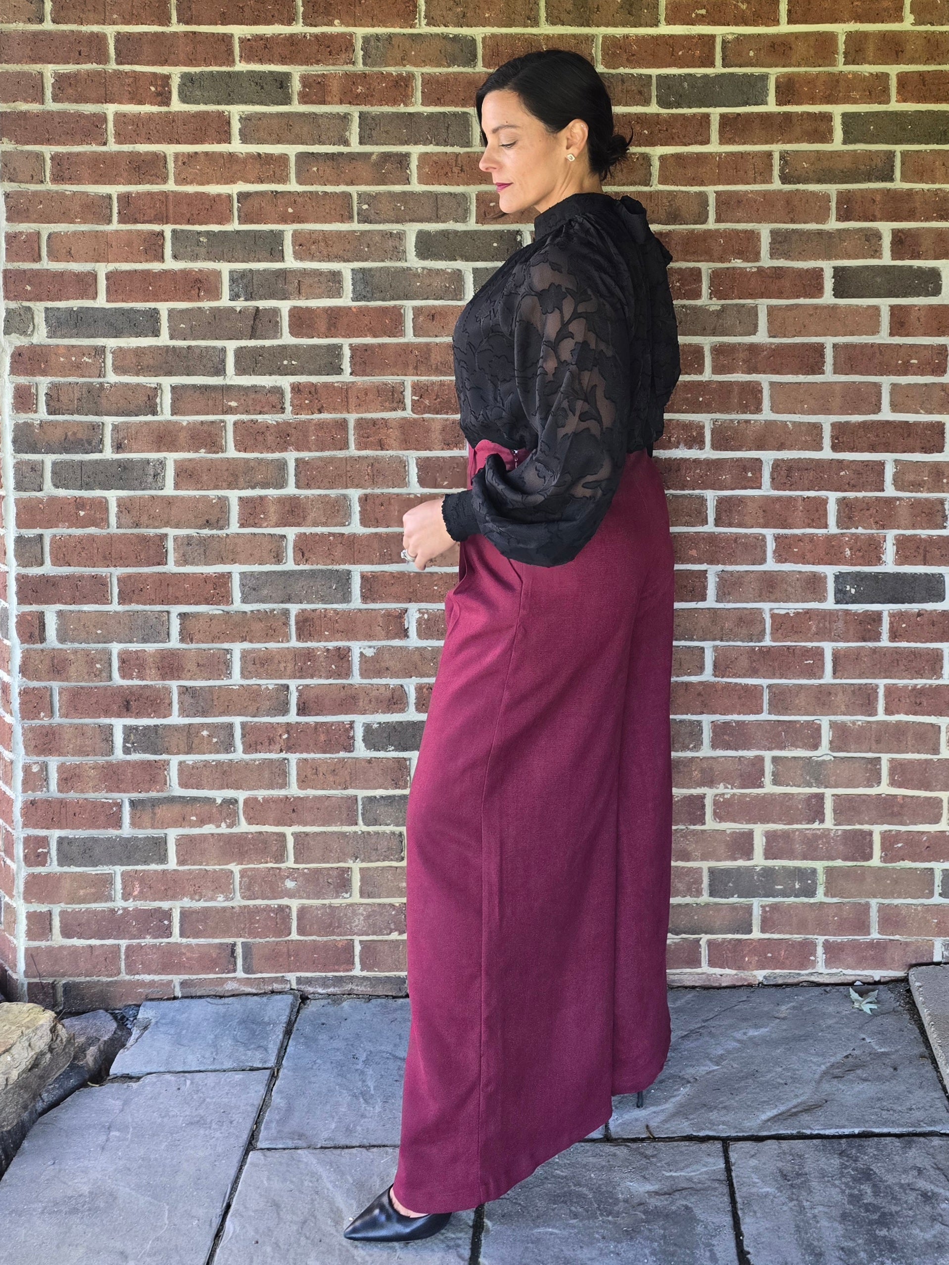Romantic, textured, and effortlessly chic, this floral burnout blouse is a true statement piece. Designed with semi-sheer sleeves and a soft lining through the bodice, it offers the perfect balance of elegance and sophistication. The gathered mock neckline with tie back and billowy balloon sleeves with smocked cuff create a flattering silhouette that pairs beautifully with our Scalloped Wide Leg Pleated Trousers for a polished, elevated look.
