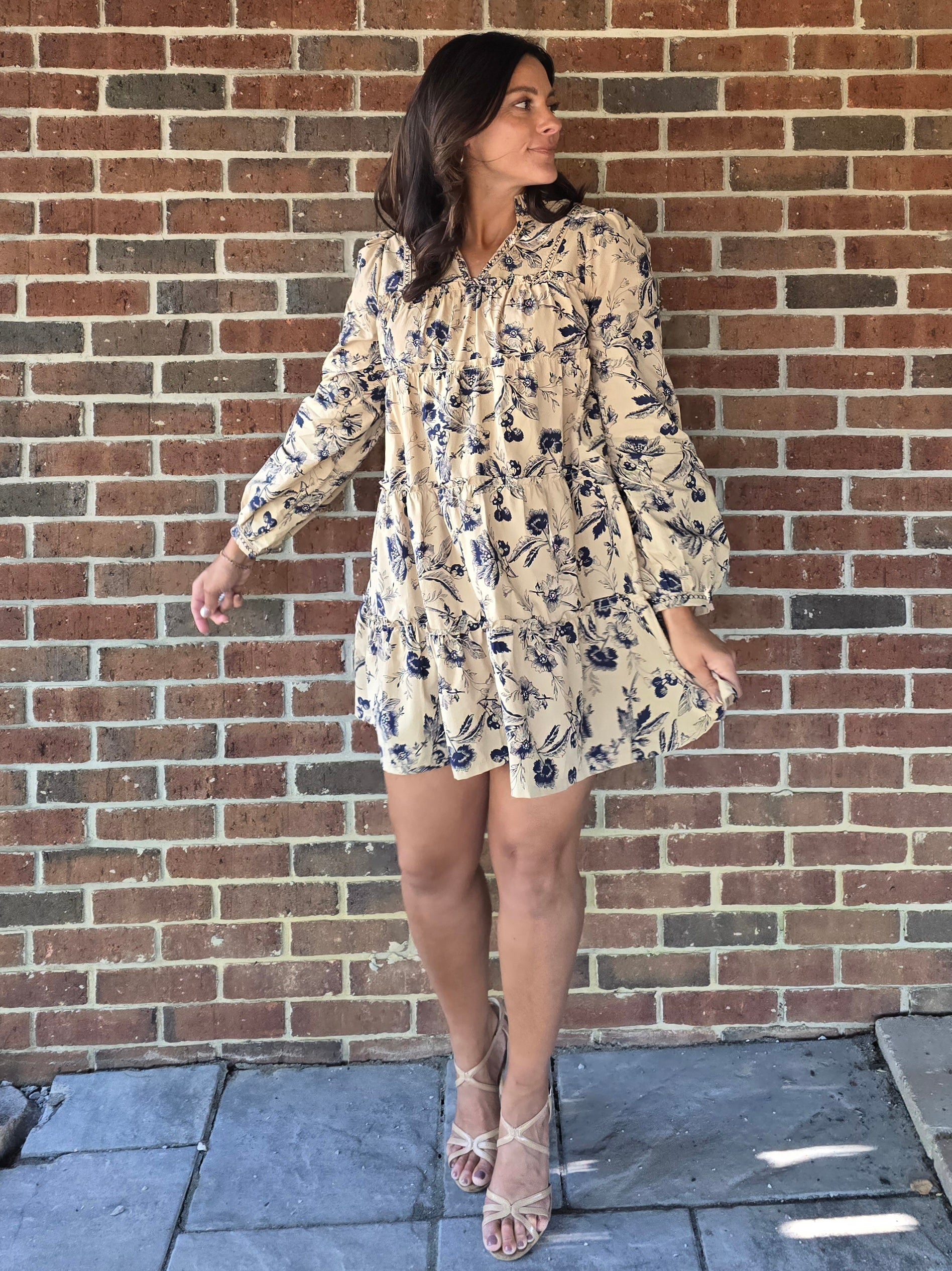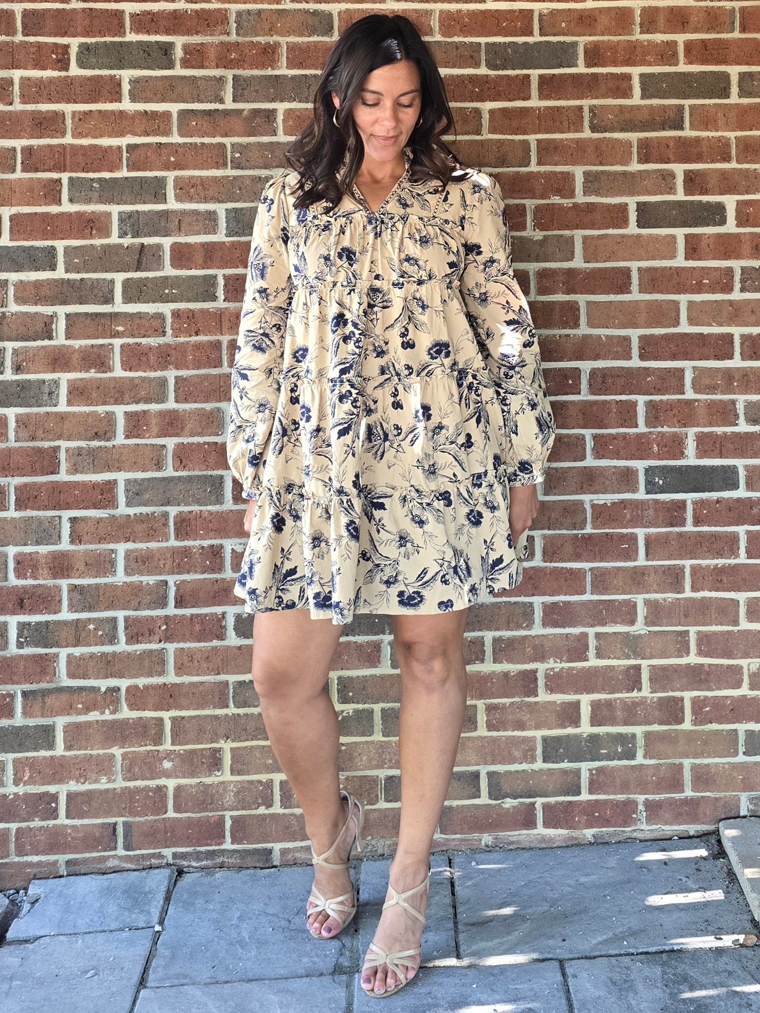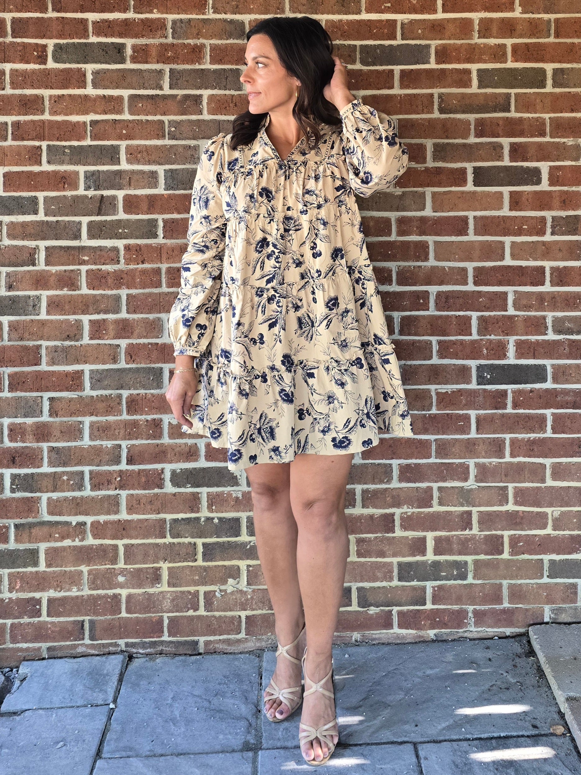Bring effortless romance to your wardrobe with the Floral Bloom Tiered Dress. Designed in a taupe base with delicate navy floral print, this dress captures timeless femininity with a modern touch. The tiered silhouette flows gracefully with every step, while long sleeves and a subtle ruffle detail at the collar add a touch of charm and sophistication. Lightweight and breezy, this dress is perfect for everything from Autumn weddings and showersto family photos. Pair it with strappy heels for a dressed-up look, or keep it casual with ankle boots and a denim jacket. No matter how you style it, this piece is destined to be a closet favorite.