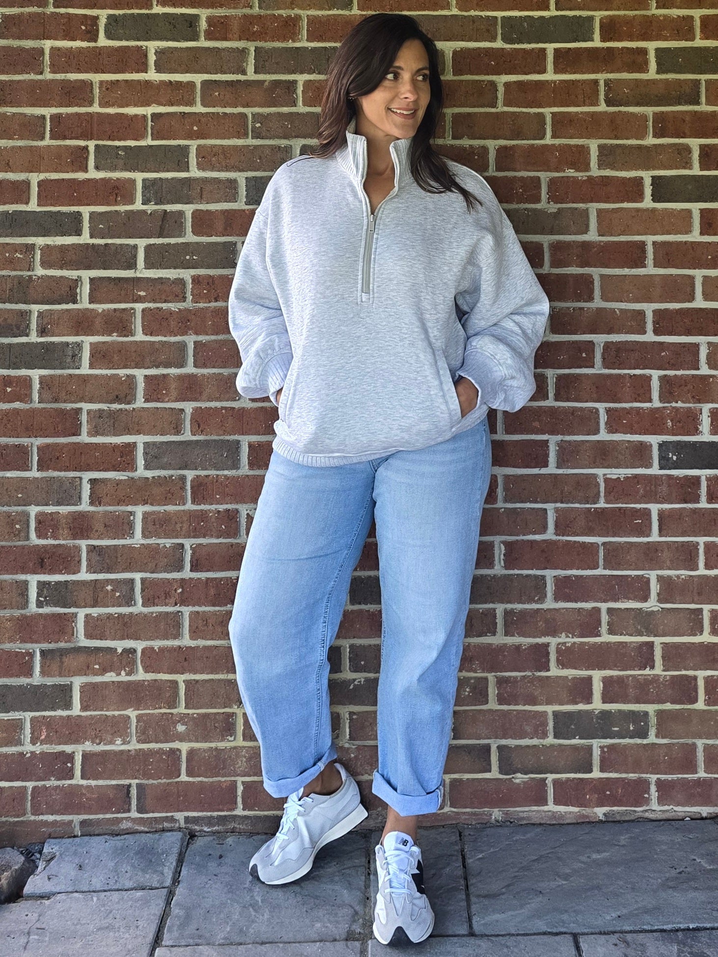 Stay effortlessly cozy and chic in our Heather Grey French Terry Fleece Quarter Zip Pullover. Made from ultra-soft French Terry fleece, this piece delivers the perfect balance of lightweight warmth and breathable comfort. Designed with a relaxed fit, dropped shoulders, and a ribbed mock-neck collar, it brings elevated style to your everyday essentials. The functional quarter zip allows for versatile styling, while ribbed cuffs and hem add a polished finish. The kangaroo pocket provide the perfect blend of practicality and ease, making this pullover your new go-to for lounging, errands, or layering on the move.