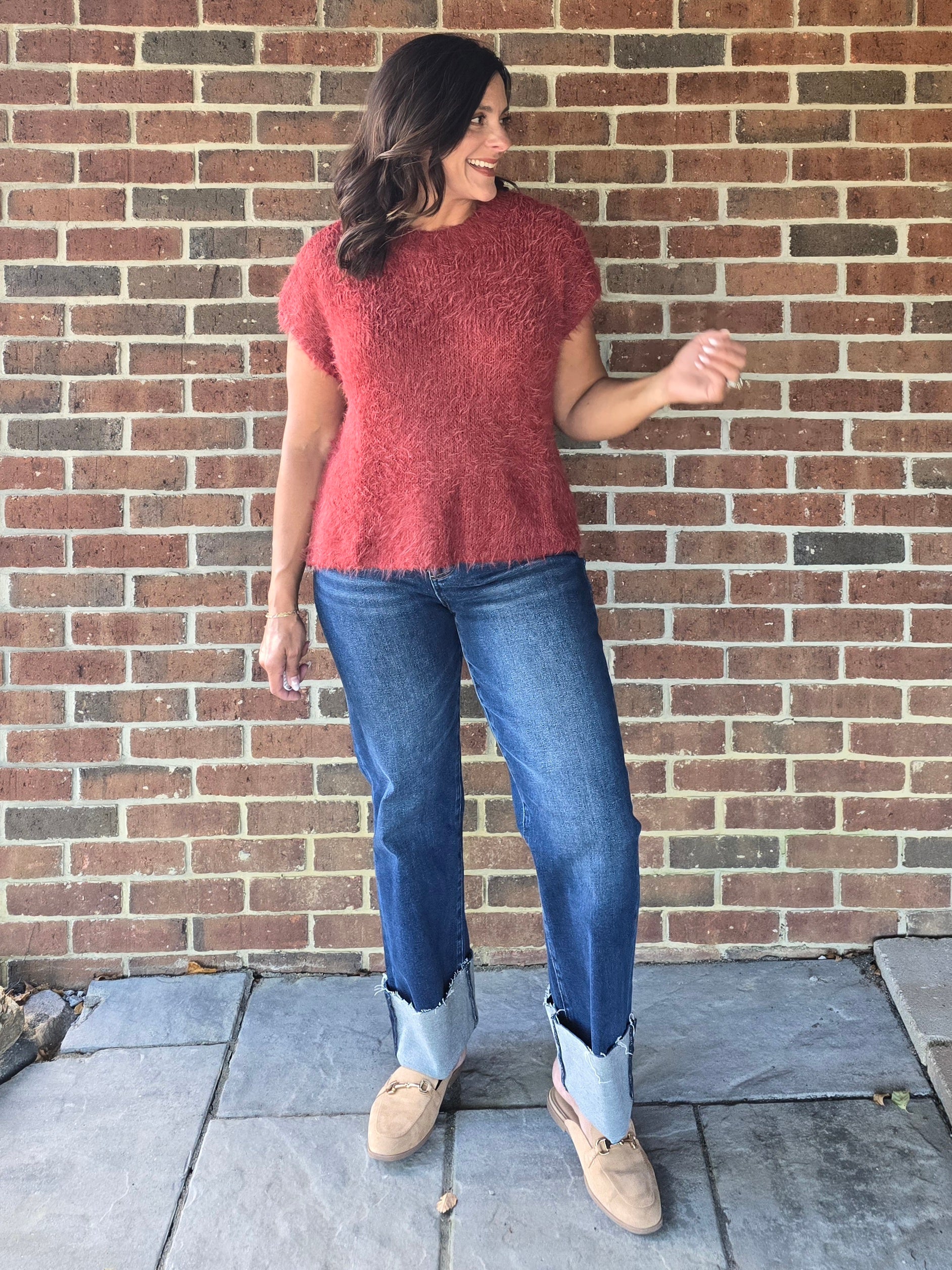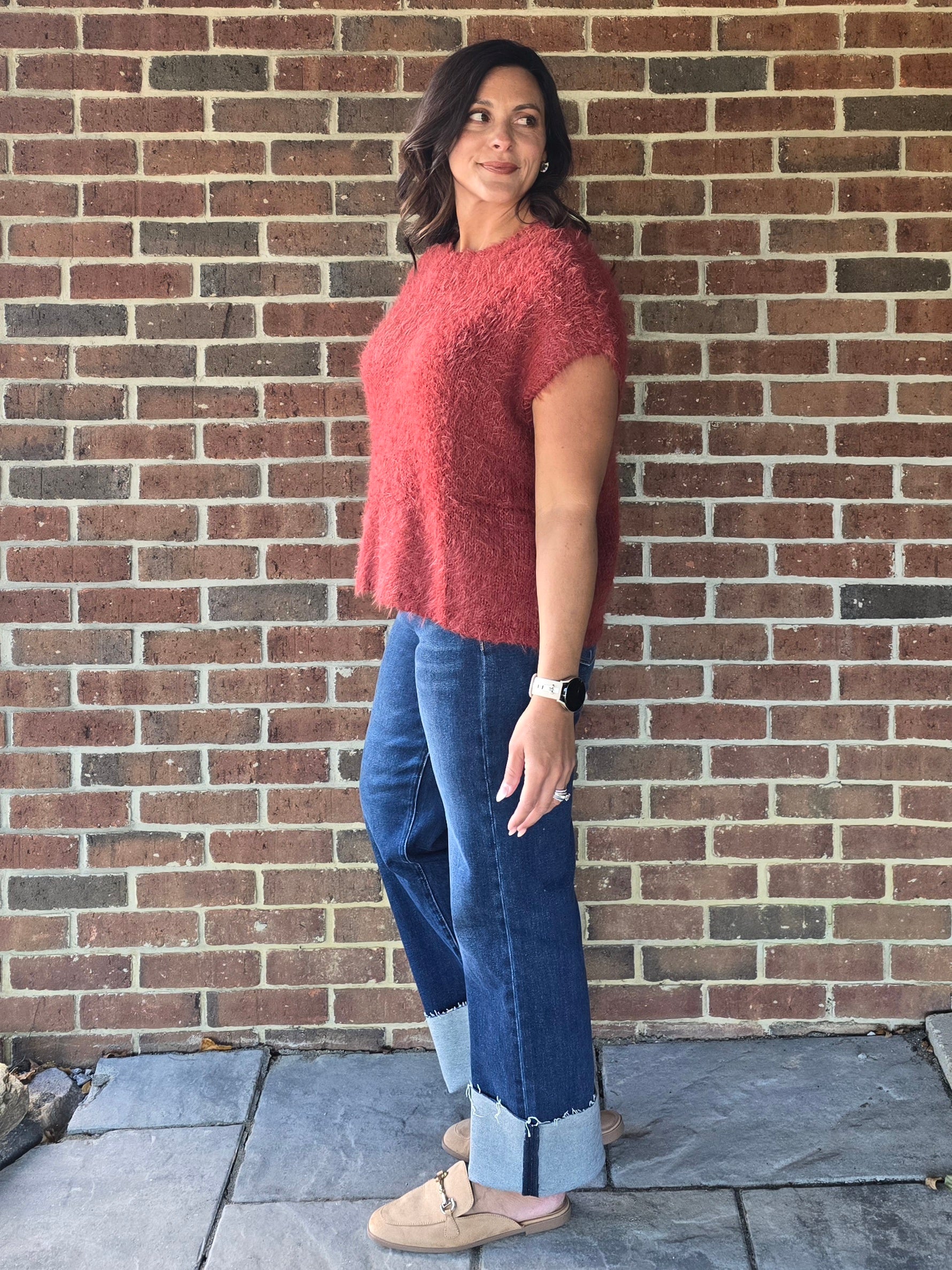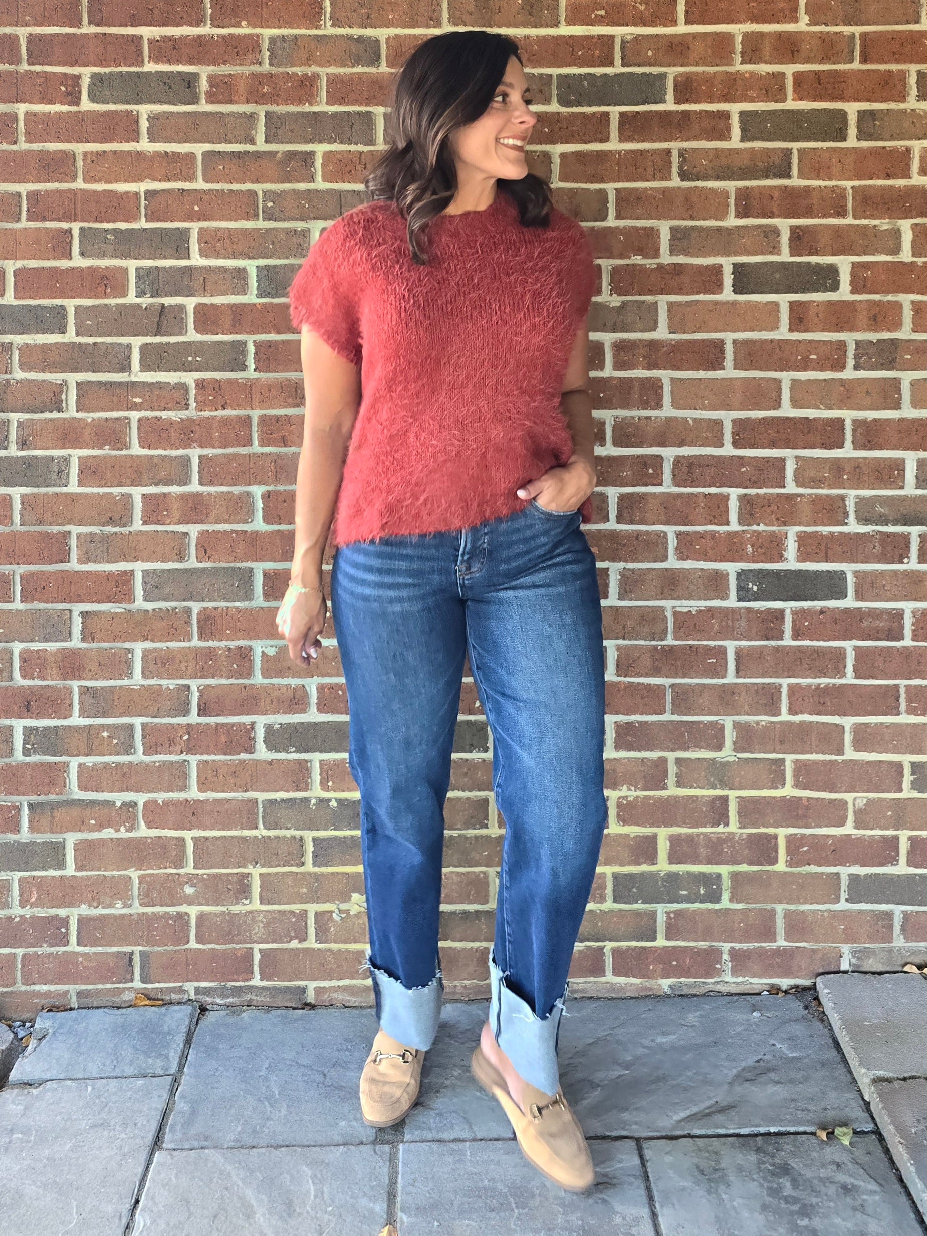 This sweater is a relaxed, loose fit. Choose your regular size or size down one size for the best fit. Erin is wearing a size Small. She is 5'4" and a size Small or Medium normally.