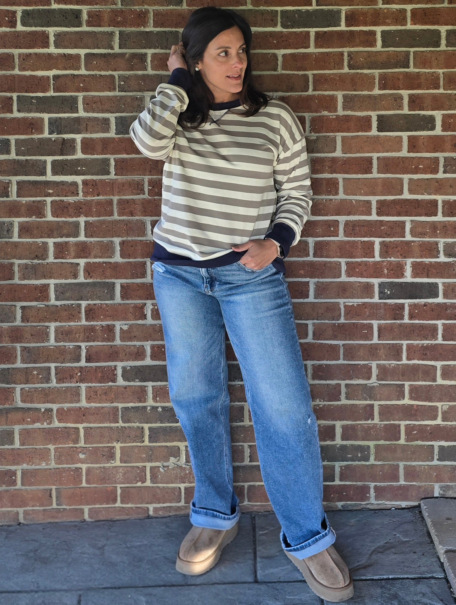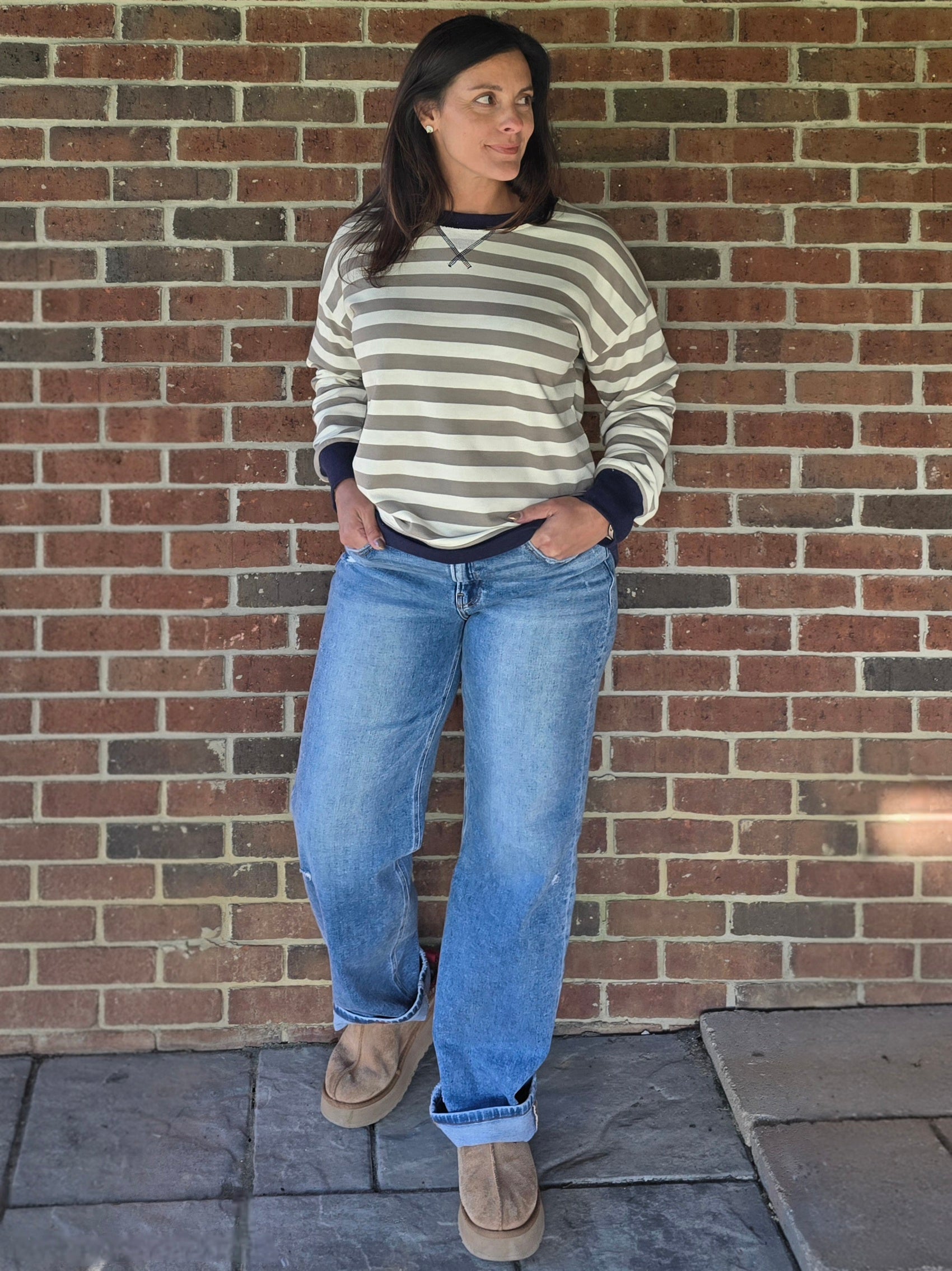 Effortlessly casual and timeless this striped pullover is the perfect blend of comfort and style. Featuring a soft cream base with subtle olive stripes and navy contrast trim at the neckline, cuffs, and hem, it’s the elevated everyday piece your wardrobe’s been waiting for. Designed with a relaxed, slightly oversized fit, this top pairs perfectly with our fave denim styles for that laid-back yet put-together look. The soft knit fabric feels smooth and cozy against the skin, making it ideal for year-round wear. From weekend errands to coffee dates, this neutral beauty adds a touch of classic charm to any outfit. An easy favorite you’ll reach for again and again.