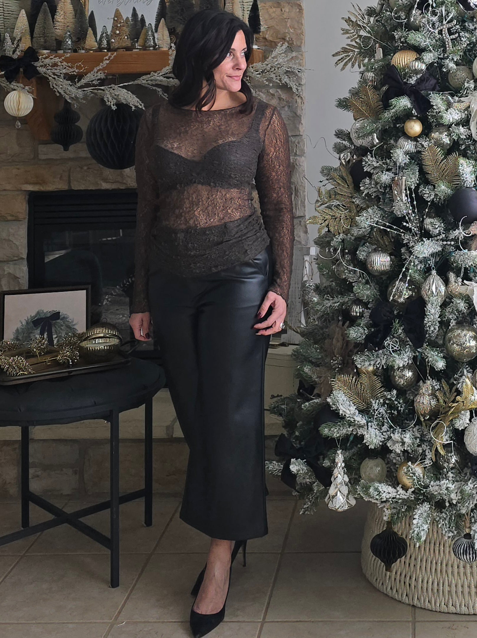 Romantic, delicate, and beautifully detailed—this sheer lace long sleeve brings a blend of elegance and edge. The rich pewter tone picks up olive gold and charcoal tones as well. This top creates a luxe feel perfect for layering over a cami or bralette. Designed with stretch lace, a fitted silhouette, and feminine texture, this piece is stunning for date night, holiday parties, or styled under jackets for an elevated layered look. Also available in Mulberry.