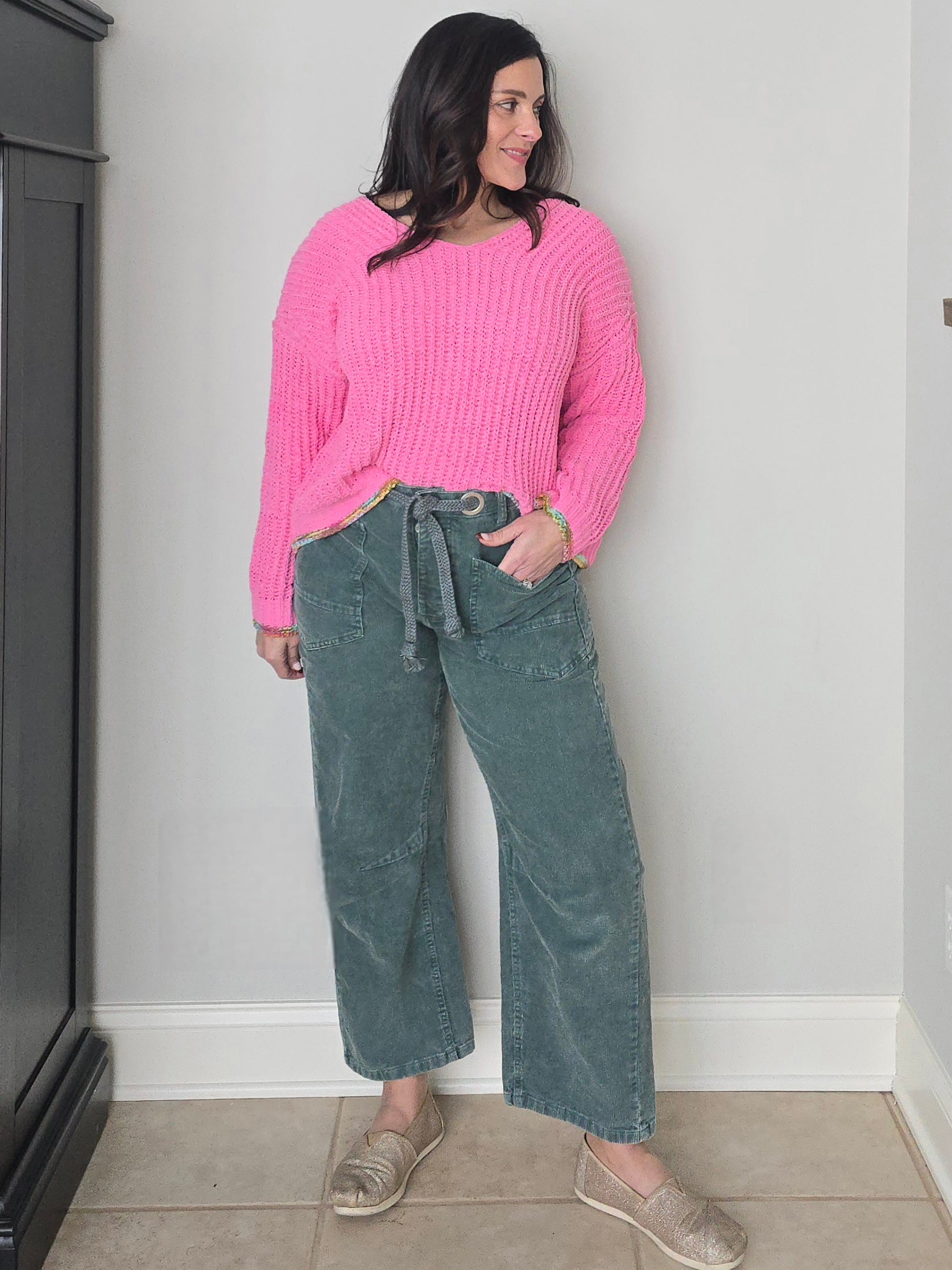 Make a statement in cozy color with this pink chunky knit V-neck sweater. Designed with a relaxed, oversized silhouette and a soft chenille knit texture, this piece is equal parts bold and effortless. The flattering V-neckline and soft ribbed details make it easy to style with high-rise denim, skirts, or layered over dresses while the multi colored trim adds an additional pop of color. Perfectly cozy for the season.