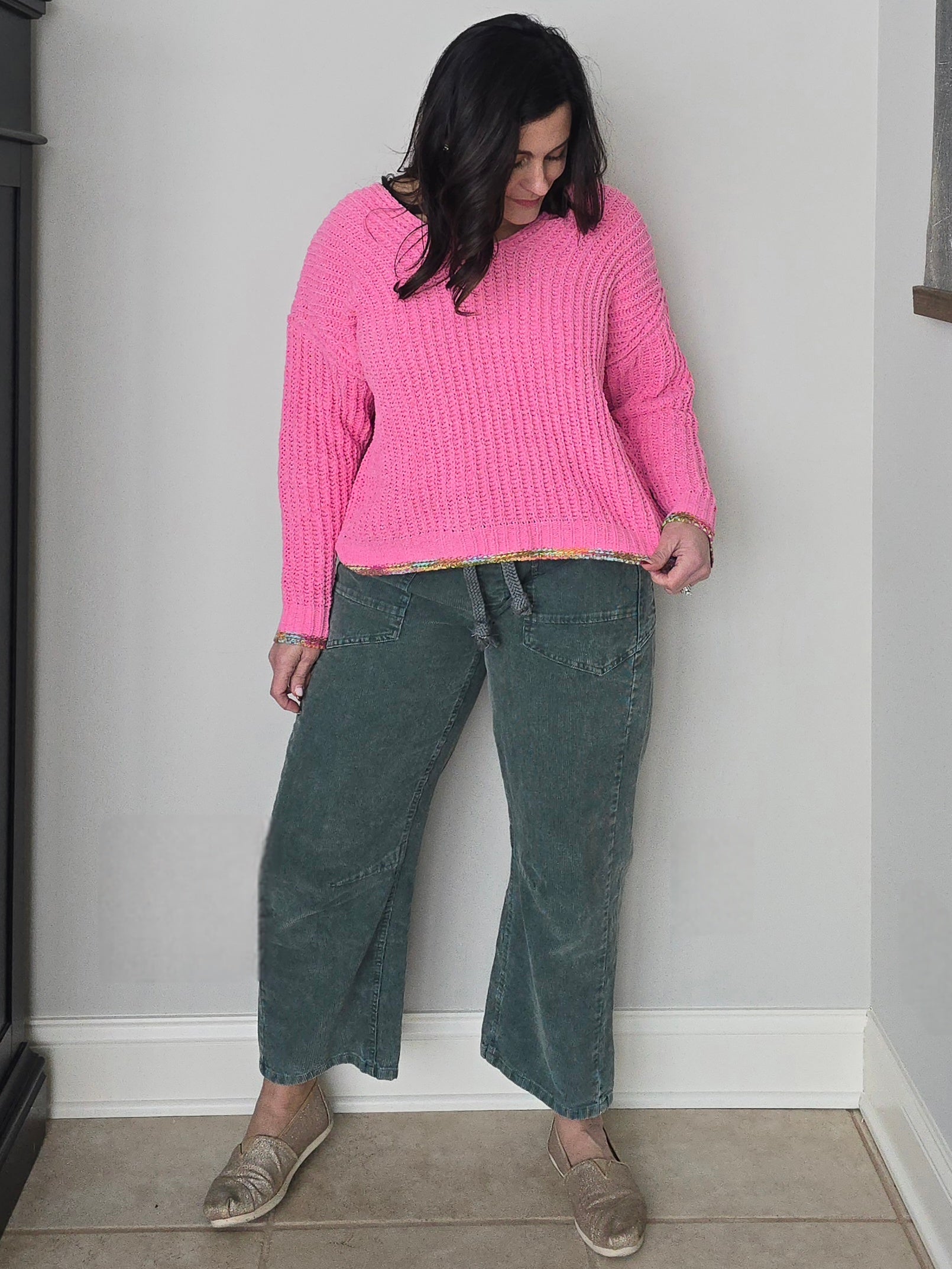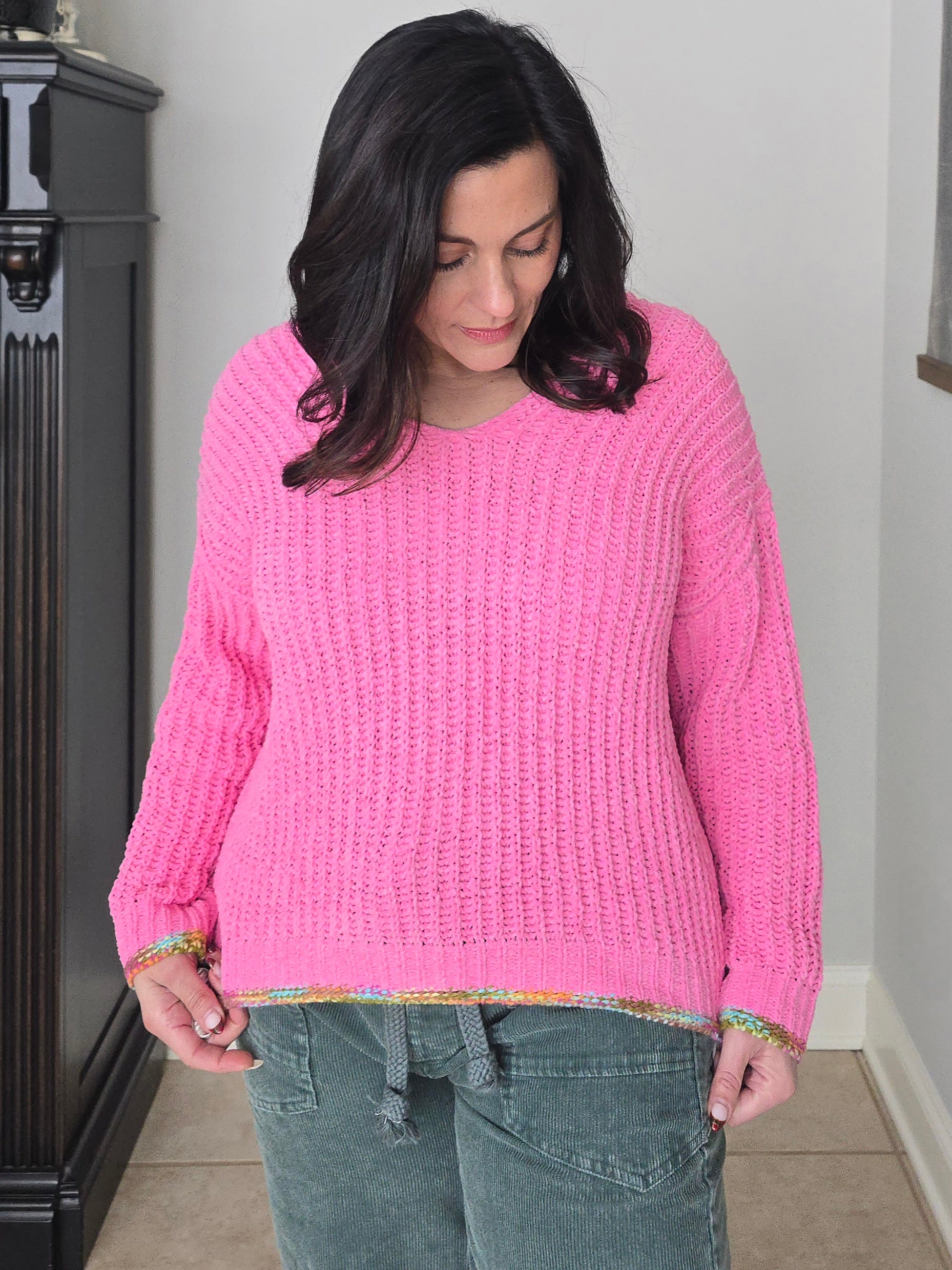 Pink Chenille Knit V-Neck Sweater with Multi Colored Trim