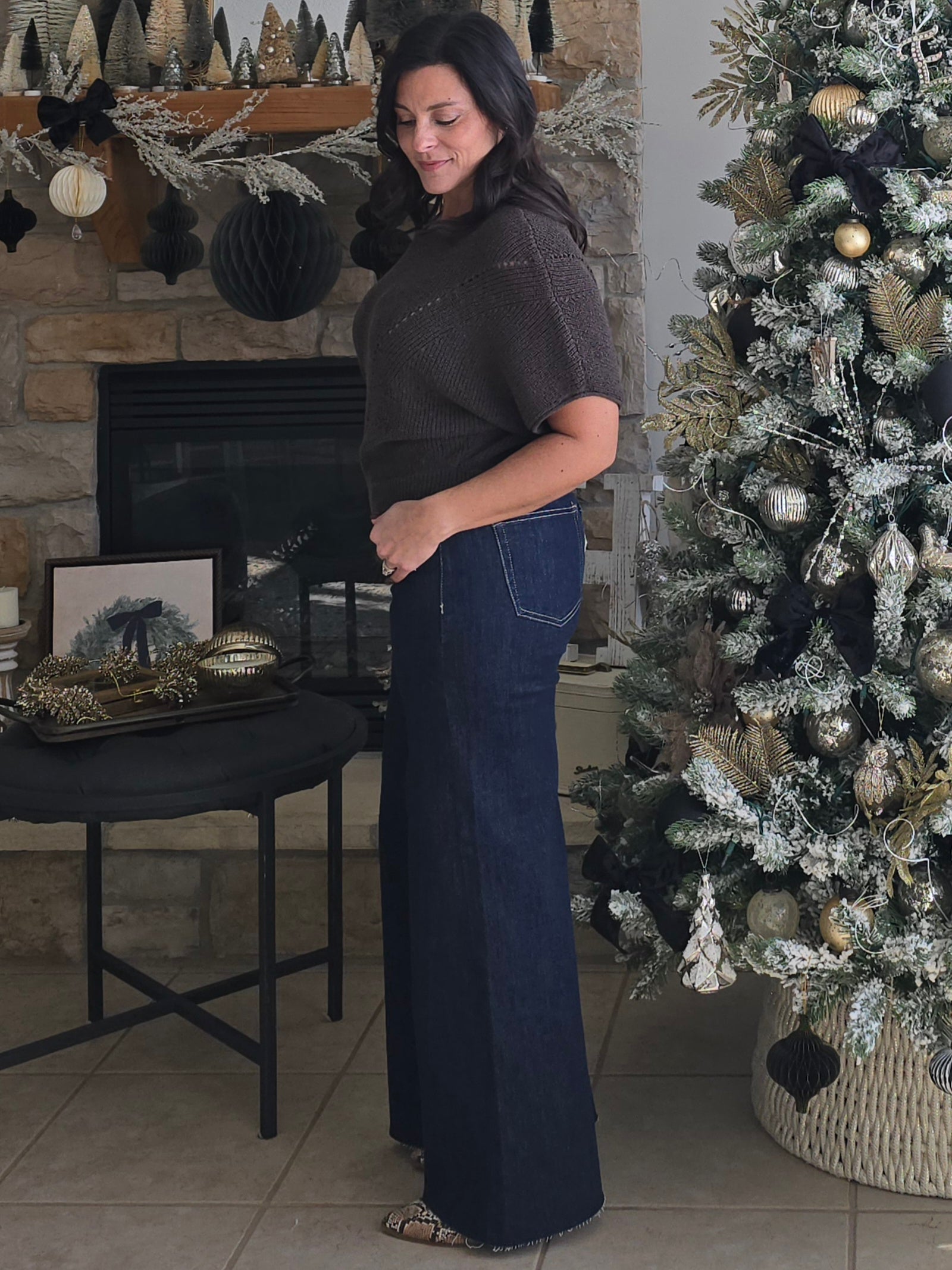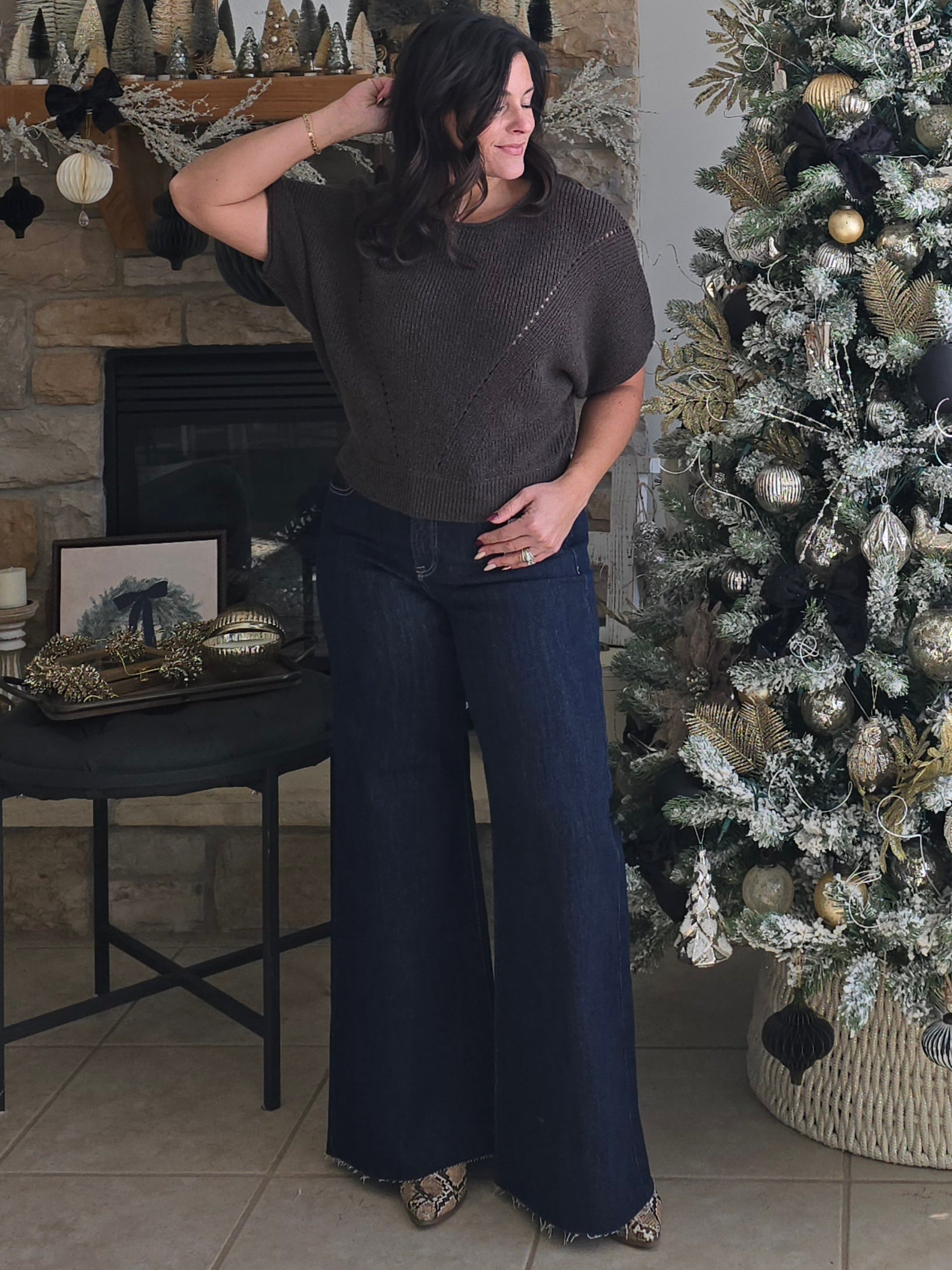Meet the sweater that blends minimalism with effortless elegance. This soft warm charcoal toned knit features a relaxed dolman silhouette, subtle sleeve volume, and beautifully placed diagonal pointelle stitch detailing that elevates the entire look. Lightweight yet cozy, it’s the kind of sweater you’ll reach for year-round. Easy to style, flattering on every shape, and endlessly comfortable. Whether dressed up with accessories or worn casually for everyday outings, it’s a truly timeless addition to your wardrobe.
