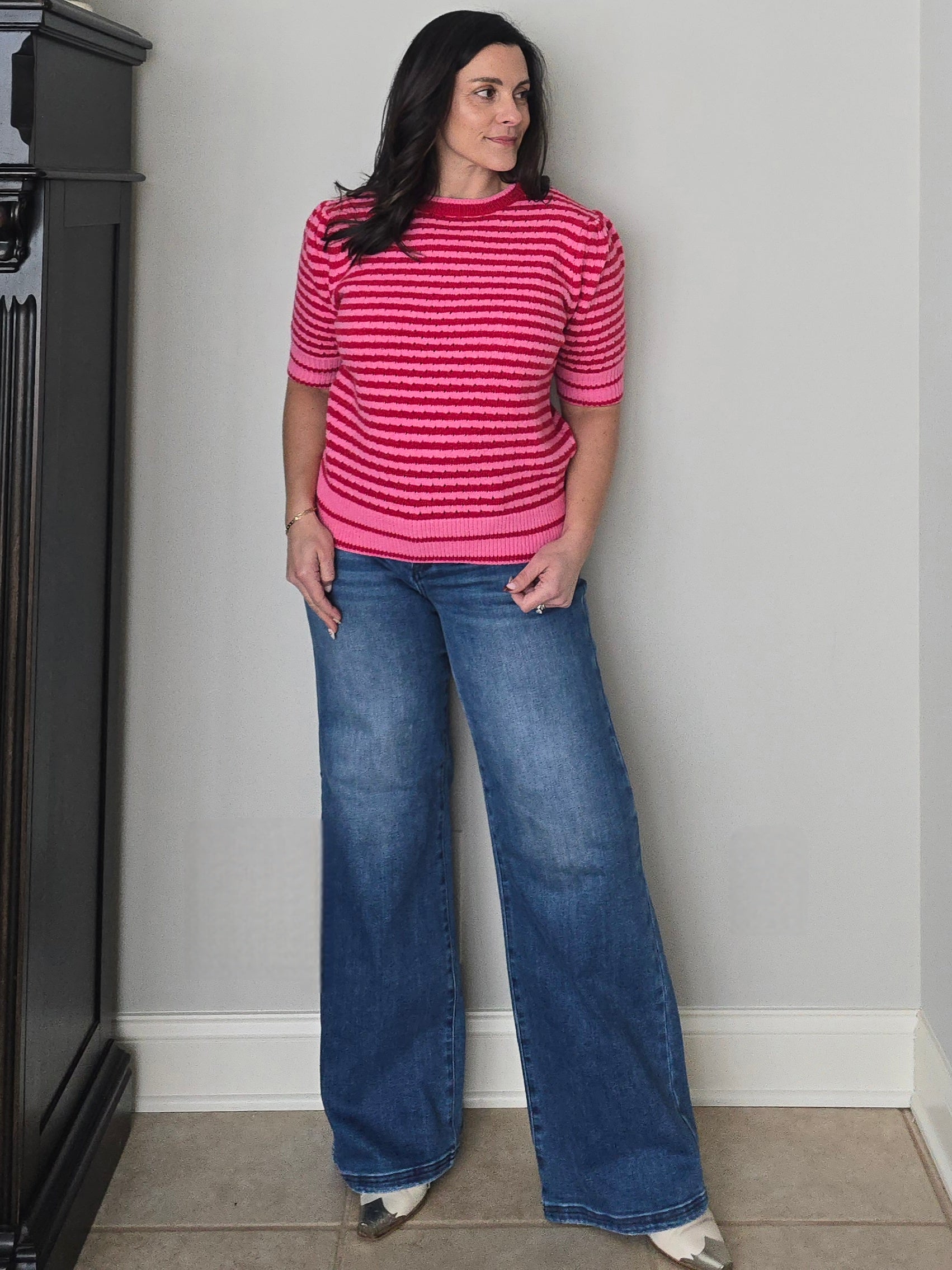 Fun, flattering, and full of personality, this red and pink striped knit top is a statement-making staple. Featuring a fitted silhouette with subtle puff sleeves and a cropped length, it’s perfect for pairing with skirts or high-waisted denim. The bold stripe pattern adds a playful touch while keeping the look polished and chic.