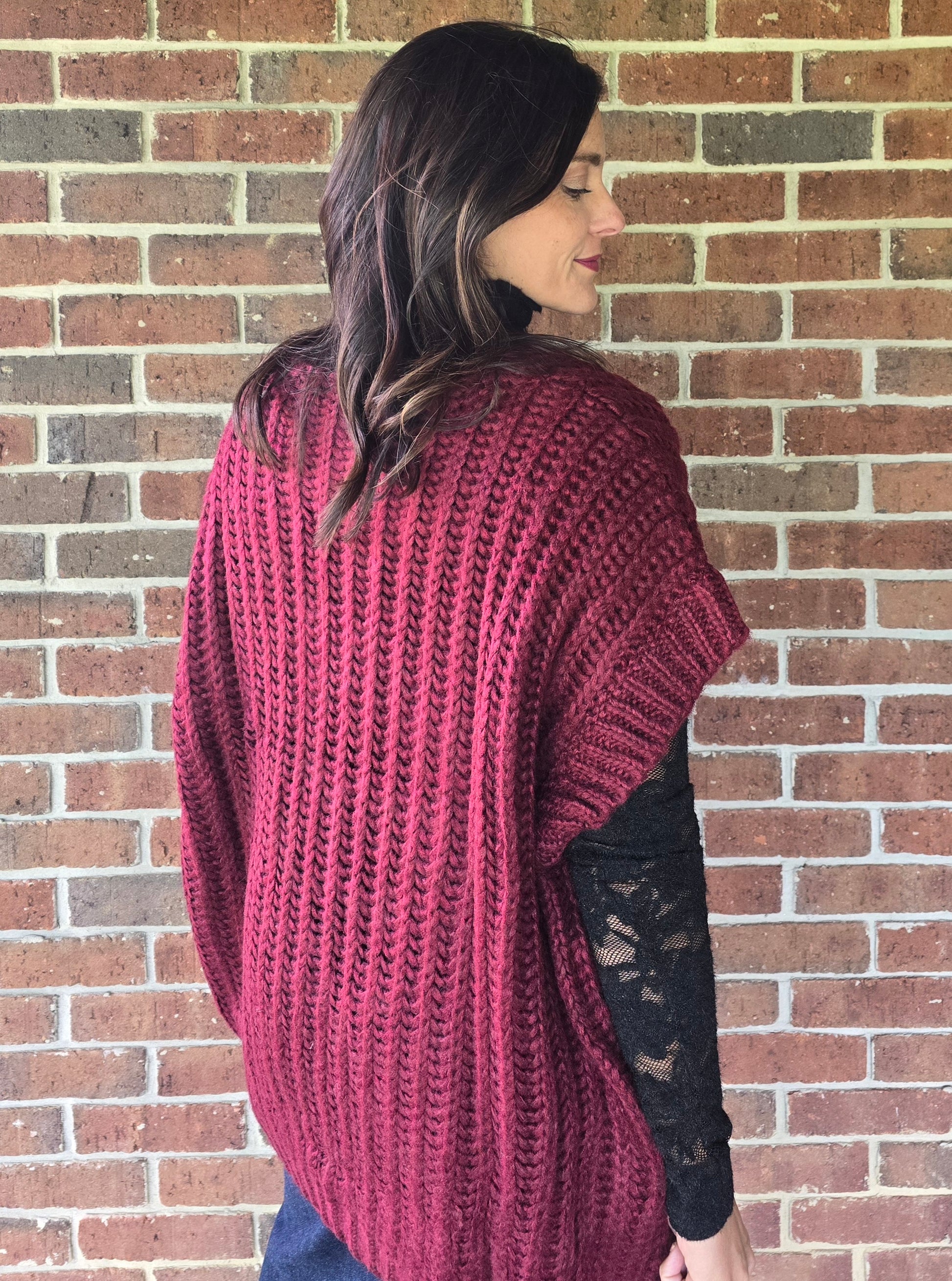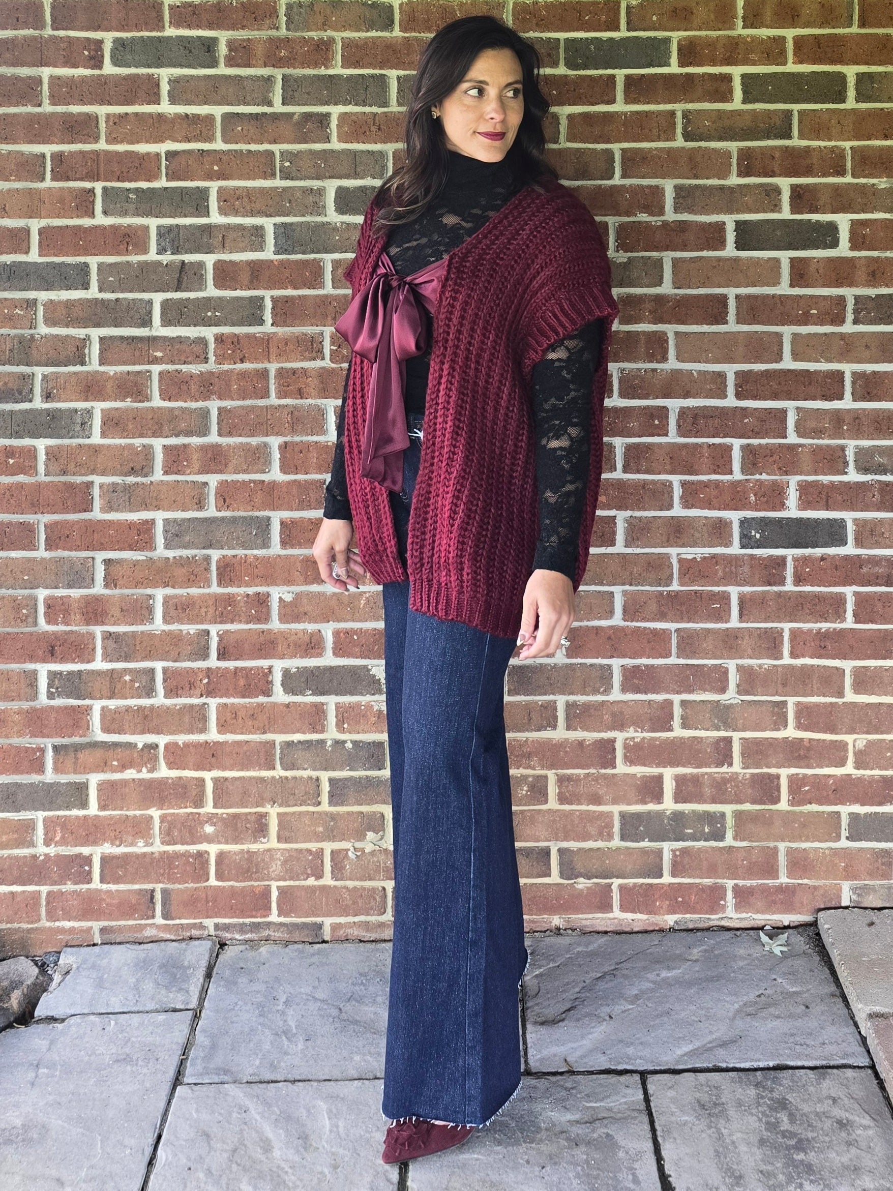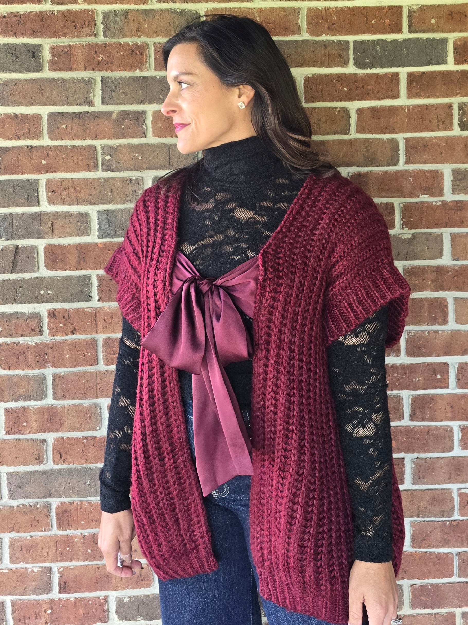 A cozy touch of sophistication, this textured knit cardigan brings warmth and style together effortlessly. Designed in a rich wine hue, it features an open front with a statement satin bow tie closure for a perfectly feminine finish. The chunky ribbed texture adds depth and dimension, while the relaxed, draped silhouette layers beautifully over our Black Lace Turtleneck Statement Top. Timeless yet playful, it’s the piece you’ll reach for all season long. Soft, flattering, and effortlessly chic.