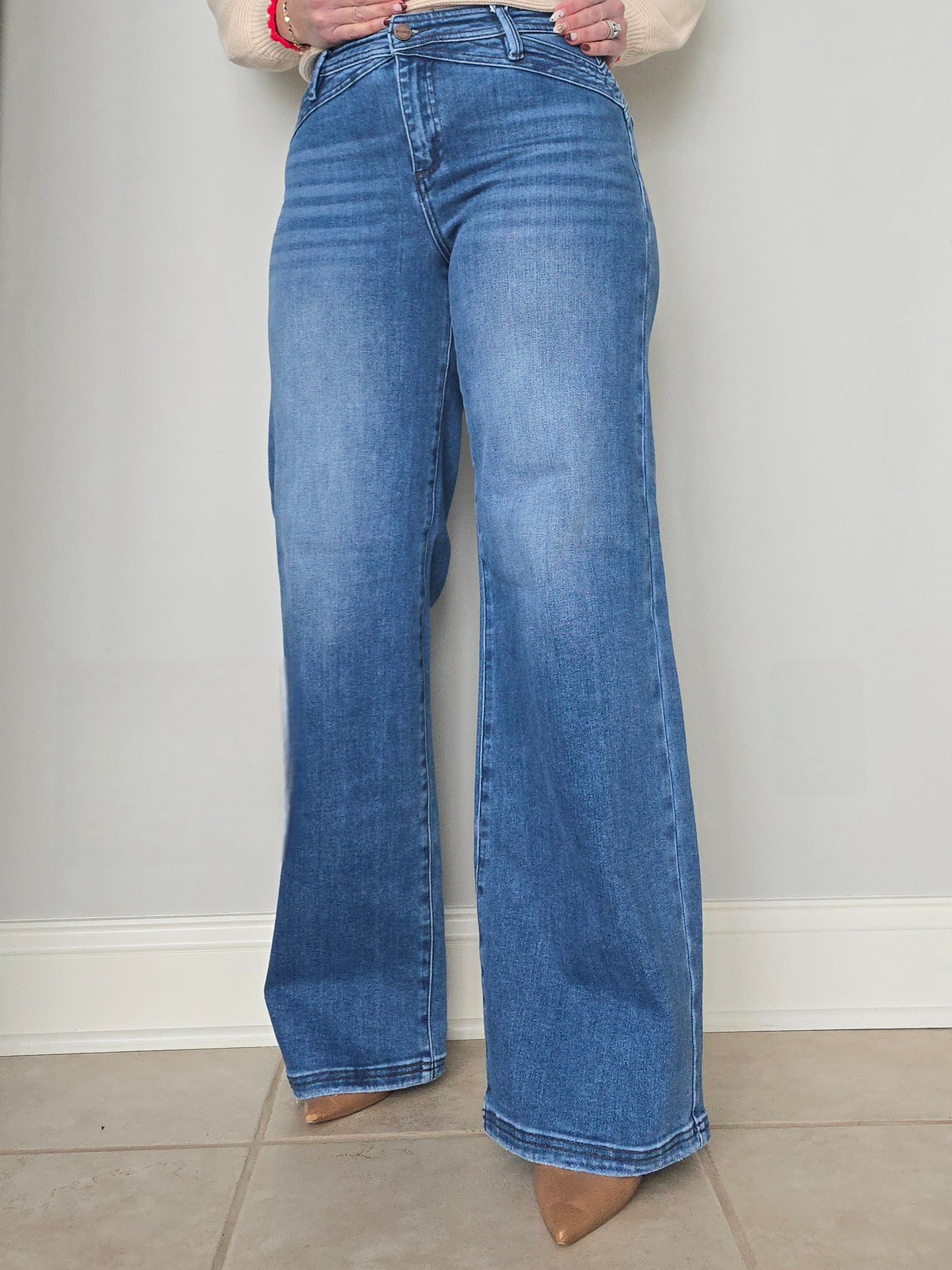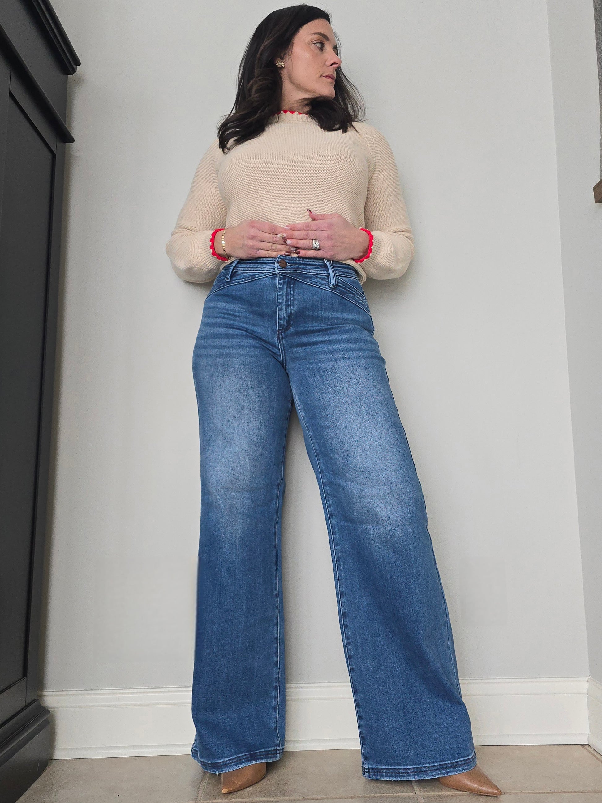 These dark wash wide leg jeans are a timeless essential with a modern fit. Featuring a flattering high-rise waist detailing and clean wide leg silhouette, they’re designed to elongate and flatter while remaining comfortable for everyday wear. Dress them up or keep them casual—either way, they’re a closet staple.