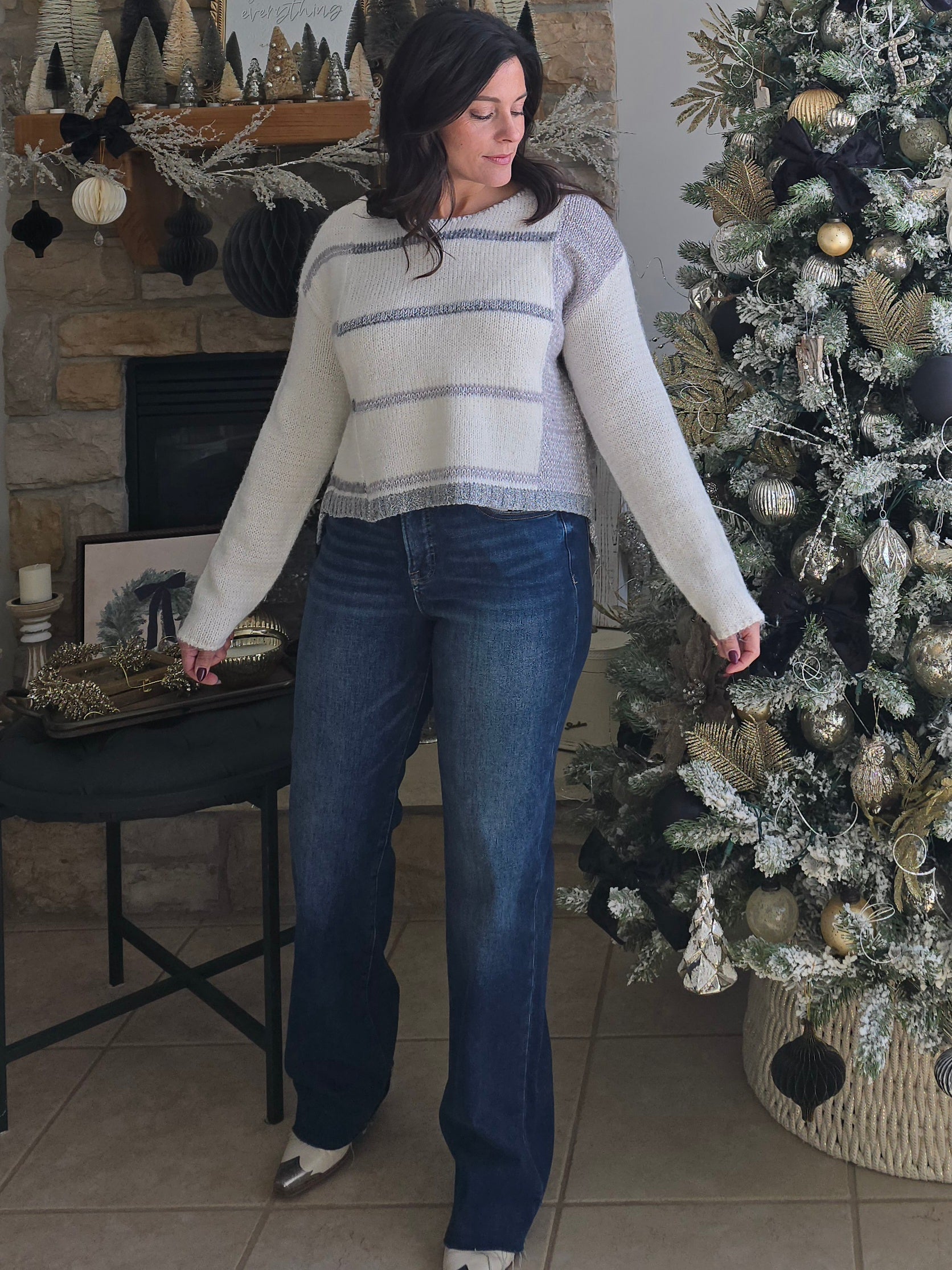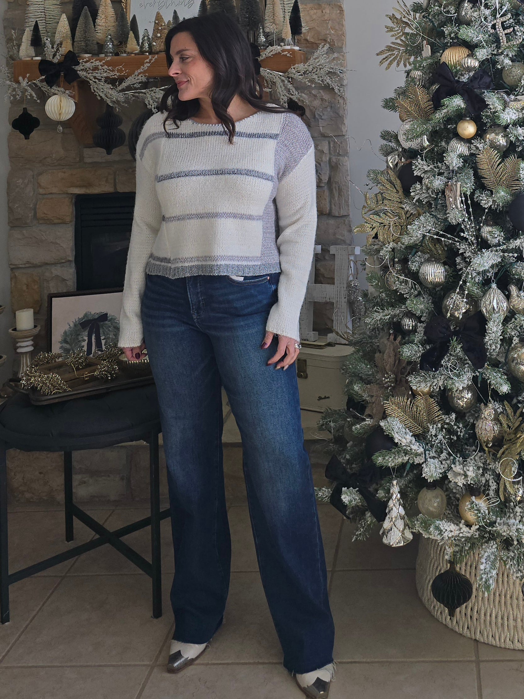 Soft, airy, and effortlessly modern, this sweater feels like wearing a cloud. Designed in a dreamy winter white knit with brushed grey striping, it features a relaxed, slightly boxy silhouette that drapes beautifully without feeling oversized. The textured hem and mixed-knit paneling add subtle dimension, giving this piece that boutique-exclusive look you'll love. Whether you're styling it casually with denim or pairing it with leggings for a cozy day, this sweater delivers comfort without sacrificing style. Lightweight enough for layering yet warm enough for chilly days, it’s the perfect everyday knit for winter and beyond.